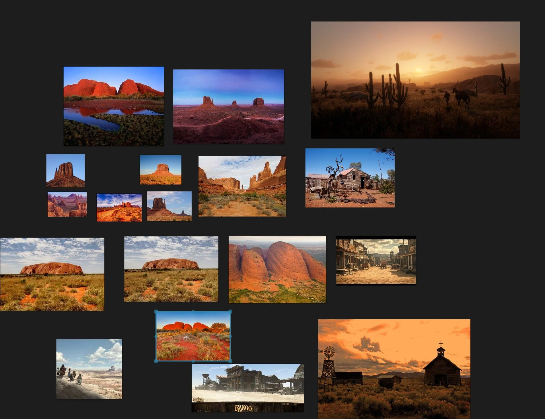 The center photos show Kata Tjuta, which is my primary reference for rock texture. I also included several photos of Monument Valley in Utah, which I used primarily for structural reference.